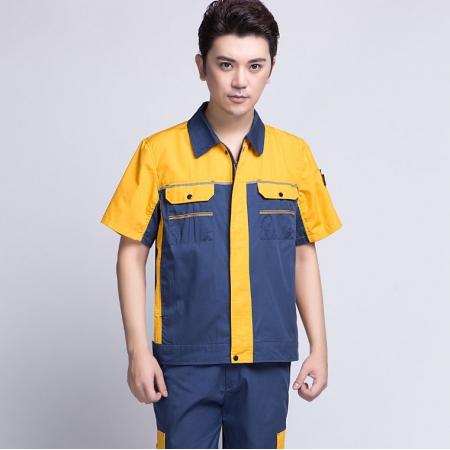 苏州鹰诺服装:深蓝配桔红短袖工作服AD069