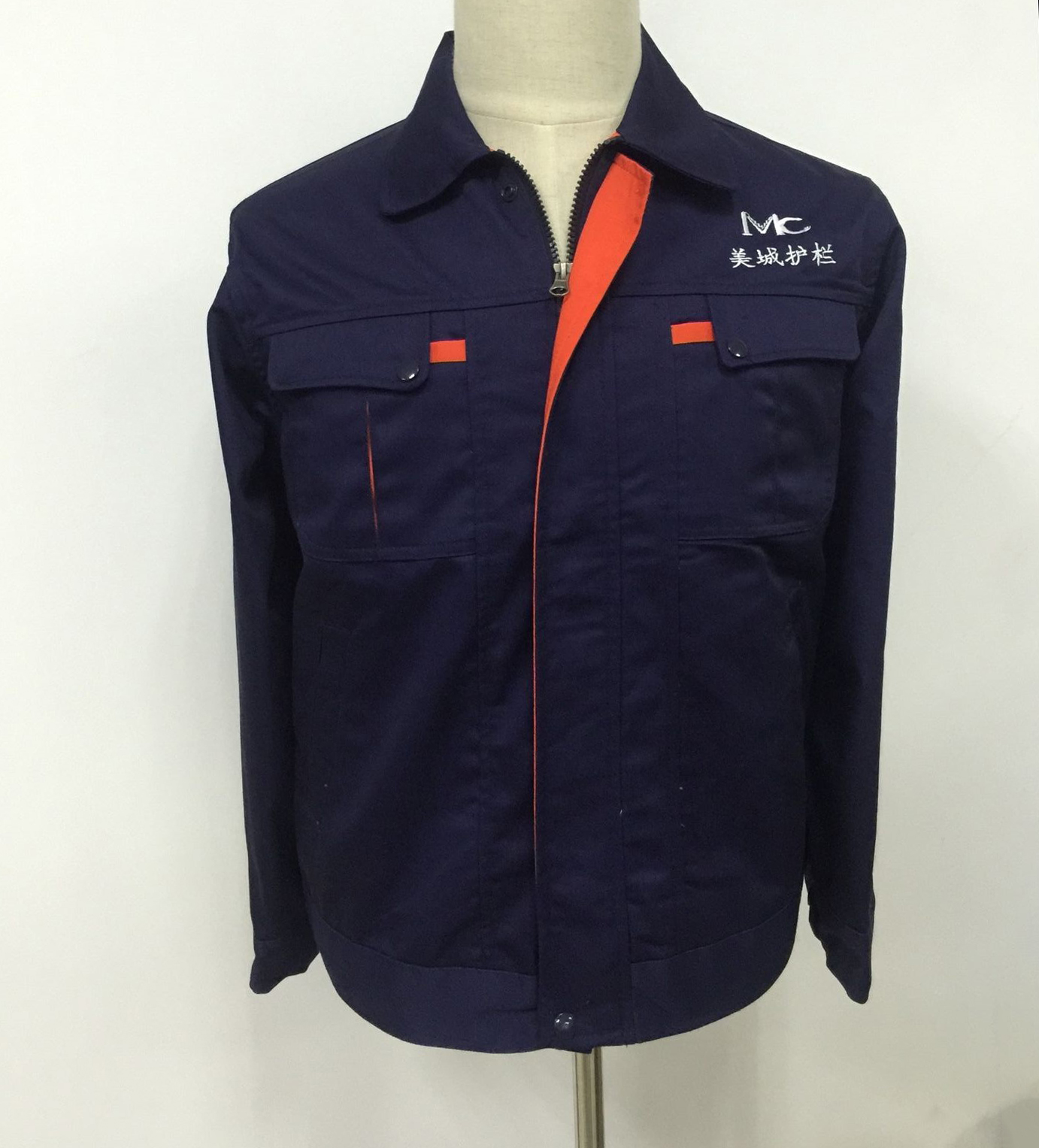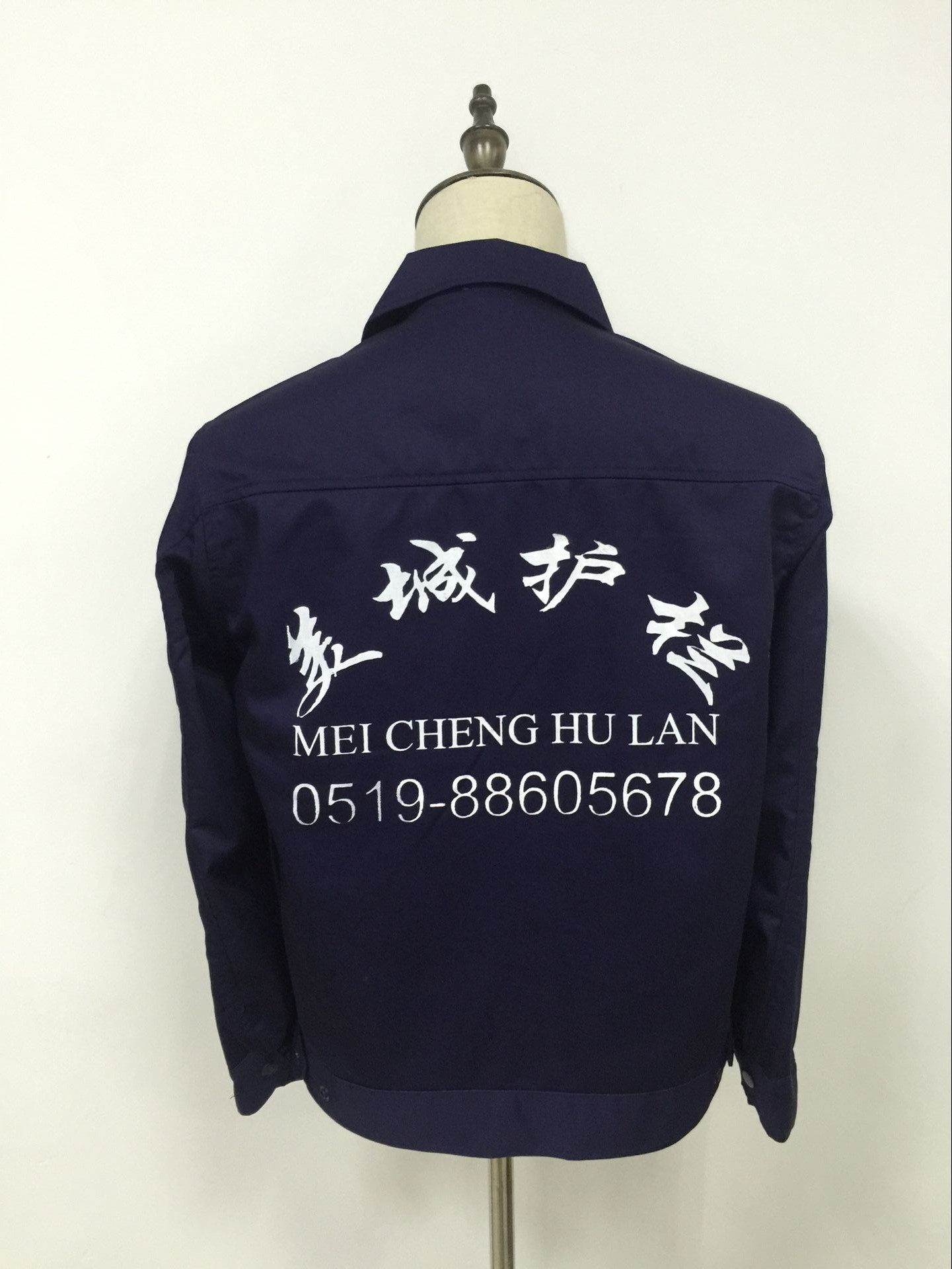 常州美城交通设施定制的春季工作服是采用我司的现货AC069款,颜色以深色藏青色为主,左前胸刺绣上公司的LOGO和名称,后背印上公司名称和电话。因为其工作服人员长期在外安装施工,所以后背印制电话也可以起到一个很好的宣传作用。