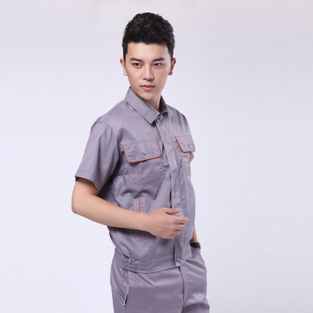 苏州鹰诺服装:浅灰拼橘黄短袖工作服AD057-DX
