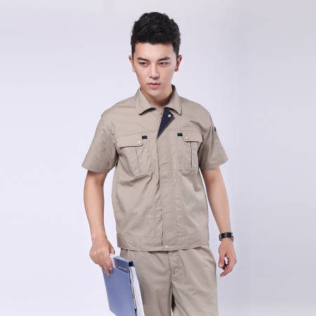 苏州鹰诺服装:驼色配深蓝短袖工作服AD073-DX