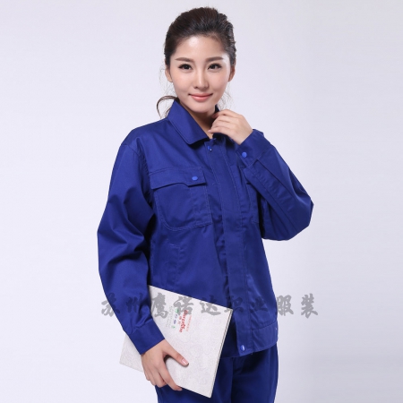 苏州鹰诺服装:艳蓝配浅灰涤棉纱卡五金塑胶工作服AC081-WJ