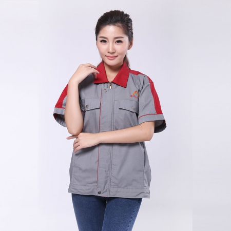 苏州鹰诺服装:烟灰拼红色短袖工作服AE595-DX