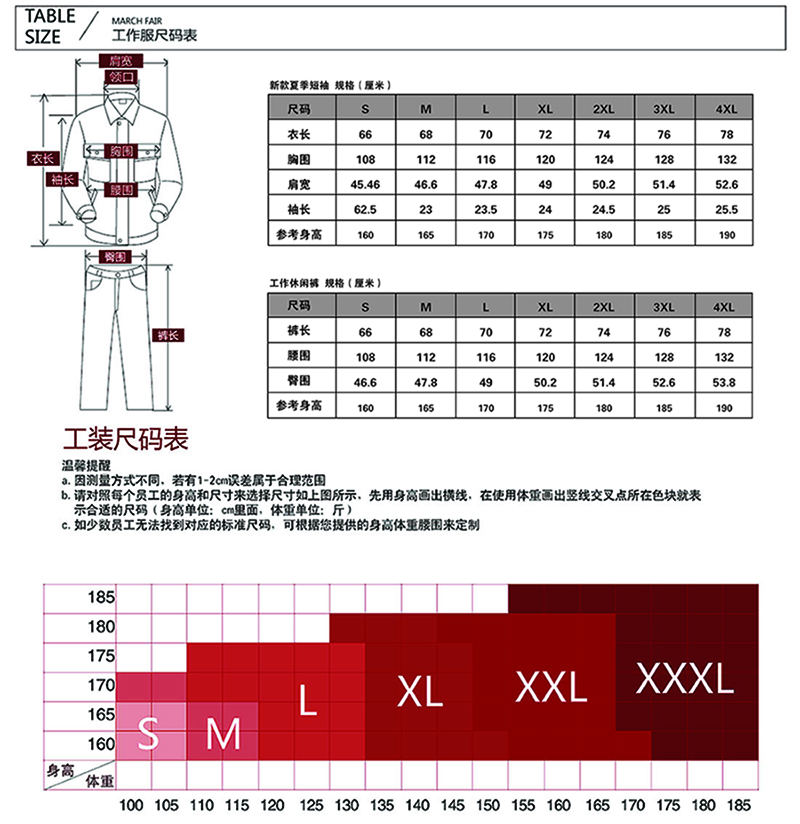 测量方法:参照下面不同色块区选择。如某员工身高175CM,体重165,那么如蓝色交叉线处色块为XXL,则夏季工作服选择XXL。个别员工无法找到尺码,请提供具体定制。