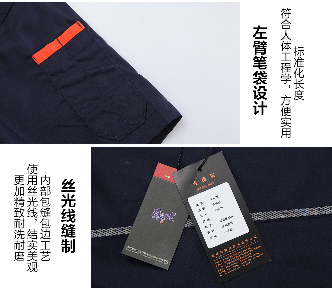 - 游客于 2017-08-01 10:26:43 发表苏州鹰诺服装:深蓝配桔红夏季工作服套装AD069