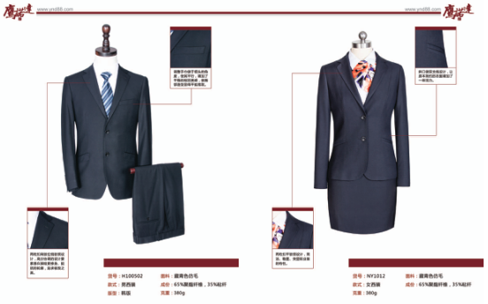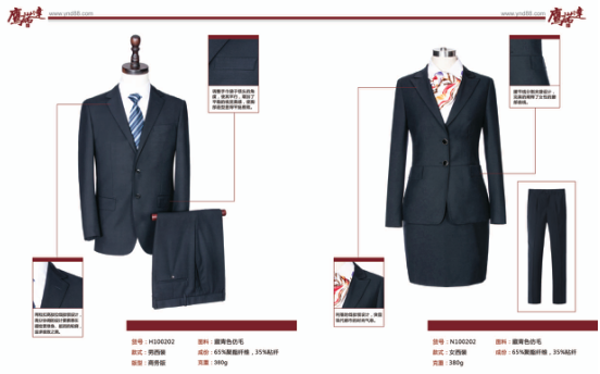 男办公人员和女办公人员的西服定制采用的是同系列的,采用的版型是韩版的西装。女士收腰设计,男士每个人的配置是2套西装+2件短袖衬衫+2件长袖衬衫。女士的则是采用的2件西装上衣+1条裤子+1条西裙,衬衫长短袖各2件。材质采用的是藏青色的仿毛。衬衫采用的是浅蓝色的高端的衬衫。