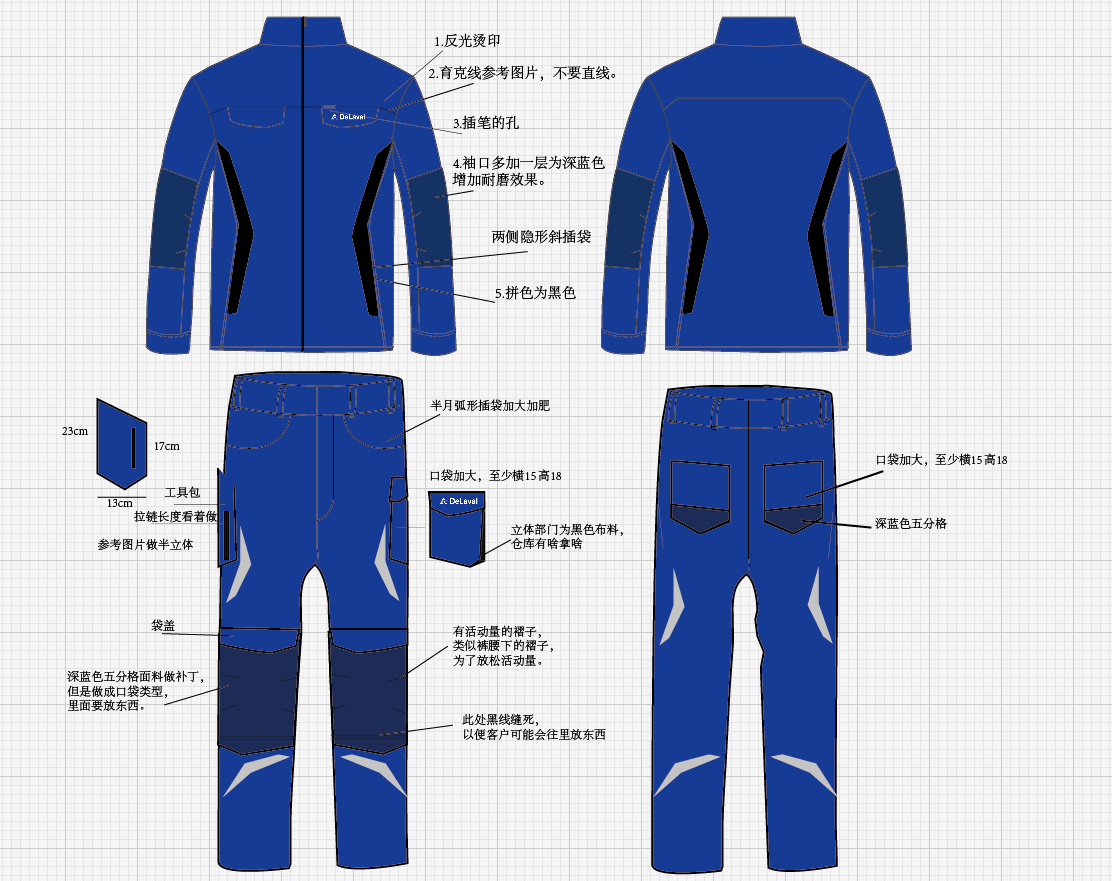 这个款式是宝蓝色和藏青色相互搭配,在腰部处闪电线缝制设计,膝盖和肘部均有加固设计,裤子上也多处采用不规则反光条,同样口袋也是多口袋的设计
