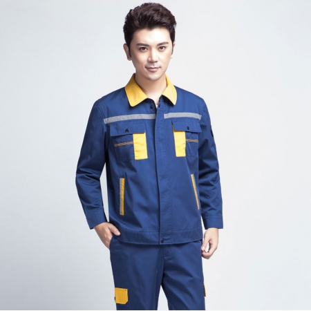 苏州鹰诺服装:驼色配深蓝涤棉纱卡冬季汽修工作服AC073-QX