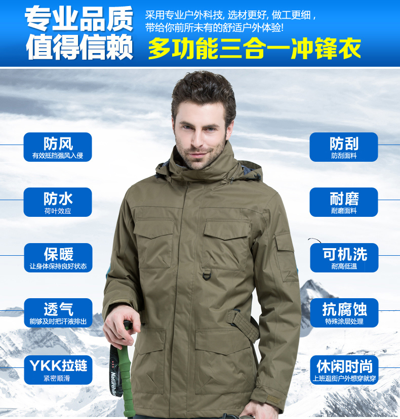 户外冲锋衣男款户外冲锋衣高端保暖三合一冲锋衣冲锋衣适合春夏秋冬户外运动冲锋衣面料科技面料冲锋衣功能:防风防水保暖透气等透气测试透气测试循环锁温,持久保暖卡其色冲锋衣可拆卸风帽门襟拉头展示外套大收纳袋耐用防风收紧贴宽大魔术粘贴腰带胸前防盗封闭口袋