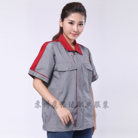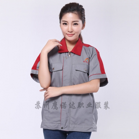 当前位置: 主页 > 苏州鹰诺服装:按工作服定制适合行业分类 > 物流运输工作服 > 烟灰拼红色夏季工作服AE595-XJ